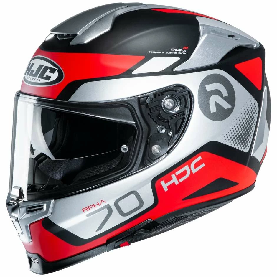 Der RPHA 70 von HJC ist ein extrem leichter und komfortabler Trikompositfaserhelm. Technische Referenzdetails für einen hochwertigen Helm, ideal sowohl auf der Strecke als auch auf der Straße. Es verfügt über ein klares Visier mit weitem Sichtfeld und eine einziehbare Sonnenblende für eine bequeme und sichere Fahrt auch an besonders sonnigen Tagen. Aerodynamisches Design mit Heckspoiler zur Erhöhung des Luftaustritts, Innenbelüftung des Helms optimiert durch Vorhandensein von oberen Lufteinlässen, die gleichzeitig die Luft ansaugen und ablassen, um eine maximale Innenbelüftung und damit einen unvergleichlichen Komfort zu gewährleisten .Die technischen Merkmale des Helms werden durch das Doppel-D-Schnallenverschlusssystem, die herausnehmbare Innenpolsterung aus innovativem antibakteriellem Material, das eine perfekte Feuchtigkeitsaufnahme garantiert, und das mit Pinlock vorbereitete Visier mit Pinlock-Linse vervollständigt, das im Lieferumfang enthalten ist. Modernes und attraktives Design und Grafiken, die den Geschmack der einfallsreichsten Motorradfahrer treffen.